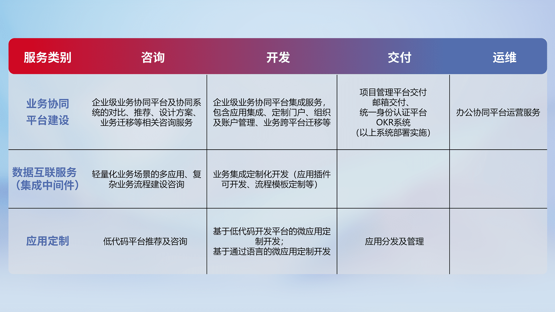 针对钉钉、、、企微、、、、IDaas等平台级产品提供产品的规划、、、、方案、、、、交付、、、、定制化开发等服务,,实现如统一协同办公、、智能客户服务、、、混合会议管理、、、、智能数据查询、、等业务场景,,实现数字化转型。。。。